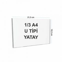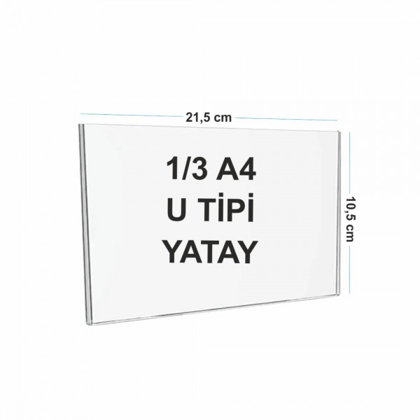 1/3 A4 (10,5×21 cm) Pleksi Afiş ve Poster Tutucu (U Tipi), dar ve uzun formatlı duyuru, yönlendirme tabelası, fiyat listesi ve bilgilendirme dokümanlarını duvara sabitleyerek sergilemek için tasarlanmış şeffaf akrilik bir döküman tutucudur. A4 kağıdın üçte biri ölçüsündeki içerikler için uygundur ve dikey kullanım sağlar.