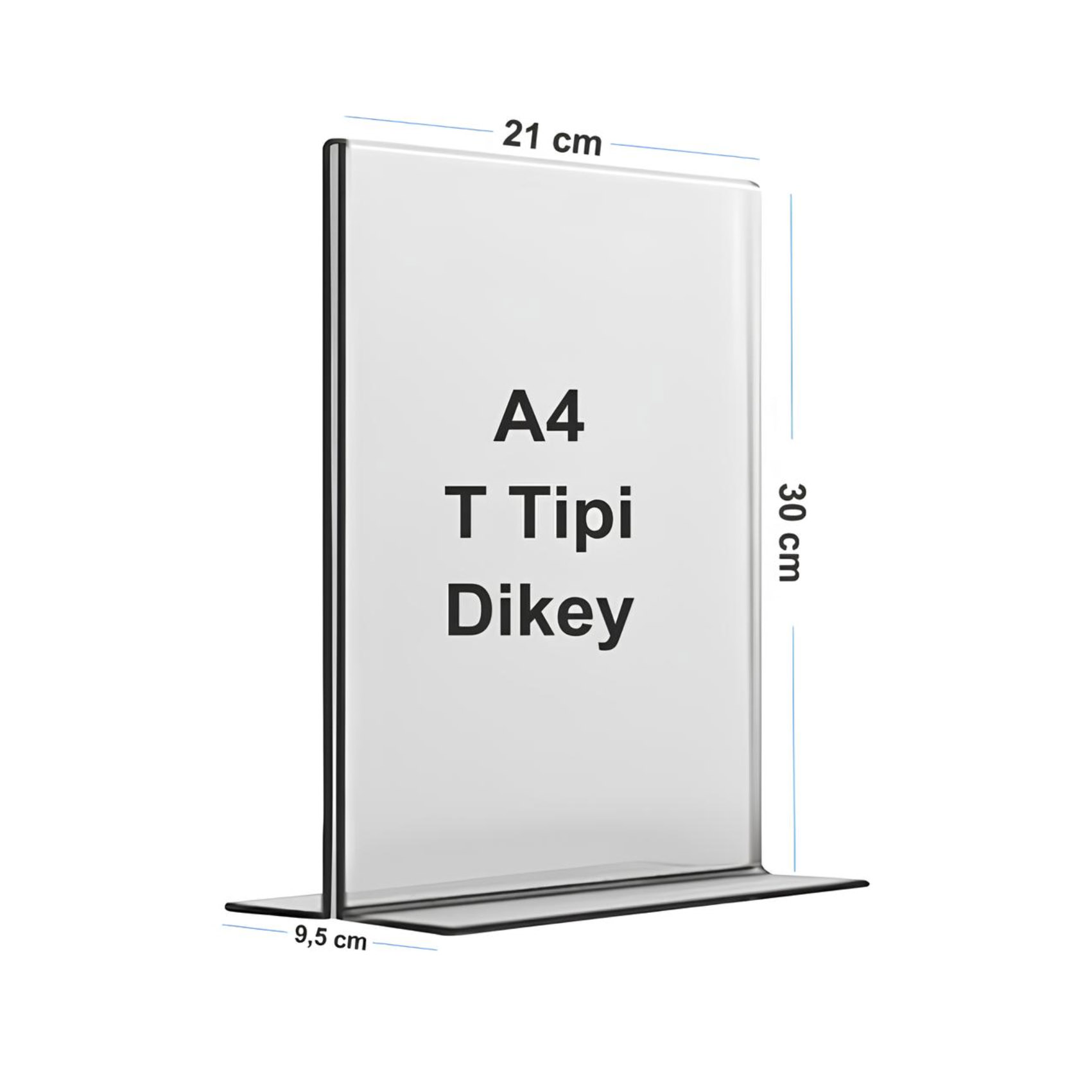 A4 (210mm x 297mm) T Tipi Masaüstü Pleksi Föylük, profesyonel görünümü, dayanıklı yapısı ve çift taraflı kullanımıyla işletmelerin tanıtım sunumlarını üst seviyeye taşır. Hem broşürlük, hem fiyatlık, hem föylük hem de menü tutucu olarak kullanılabilen bu ürün; restoranlardan otellere, mağazalardan fuarlara kadar her sektörde düzenli, estetik ve etkili bir sergileme çözümü sunar.