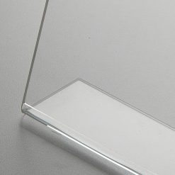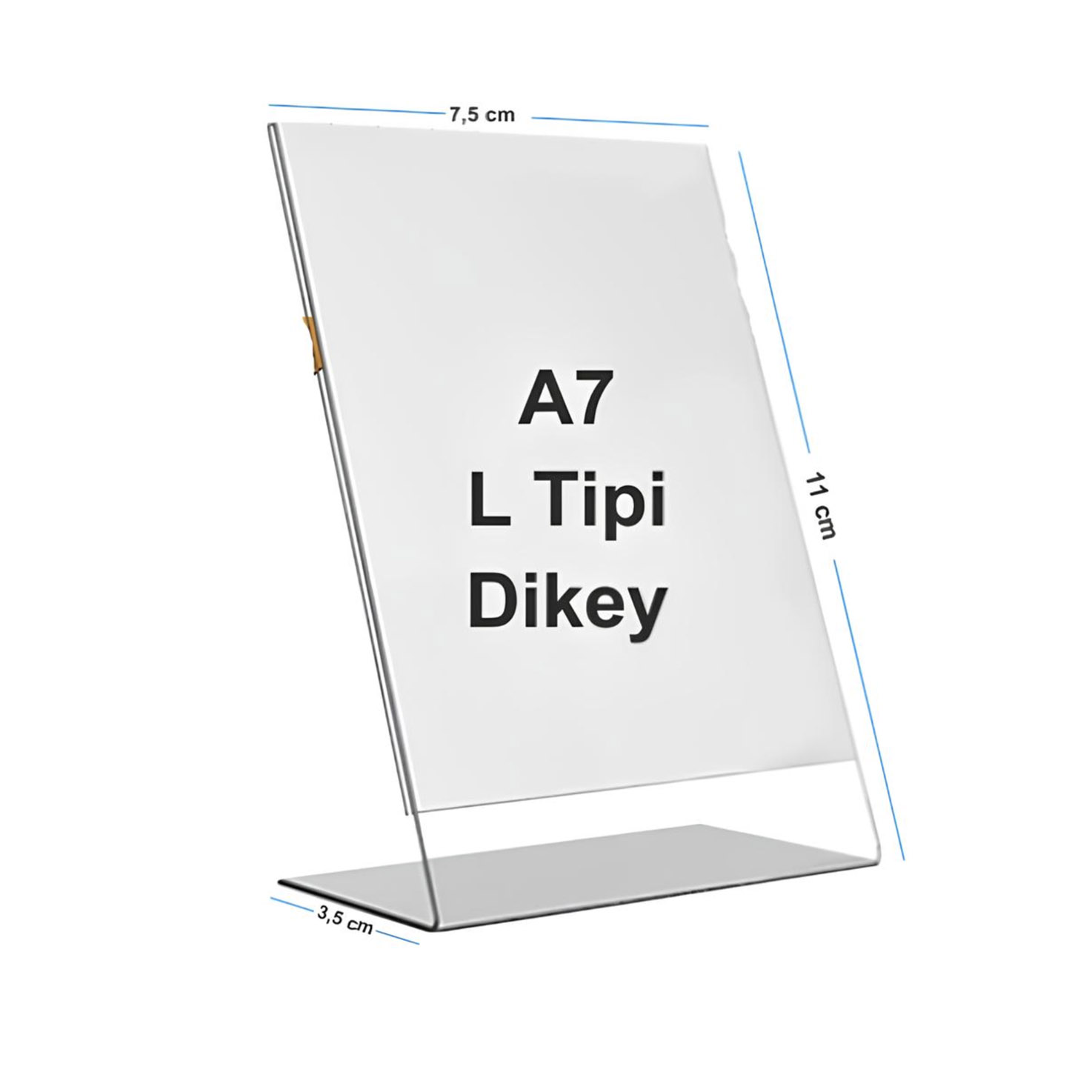 A7 (75mm x 105mm) L Tipi Dikey Masaüstü Föylük, küçük boyutuna rağmen etkileyici bir sunum gücü sunan profesyonel bir tanıtım aracıdır. Şeffaf akrilik (pleksi) malzemeden üretilen bu broşürlük, menü tutucu ve fiyatlık, işletmelerin masaüstü ya da tezgâh üzerinde düzenli ve şık bir bilgilendirme yapmasına olanak tanır.