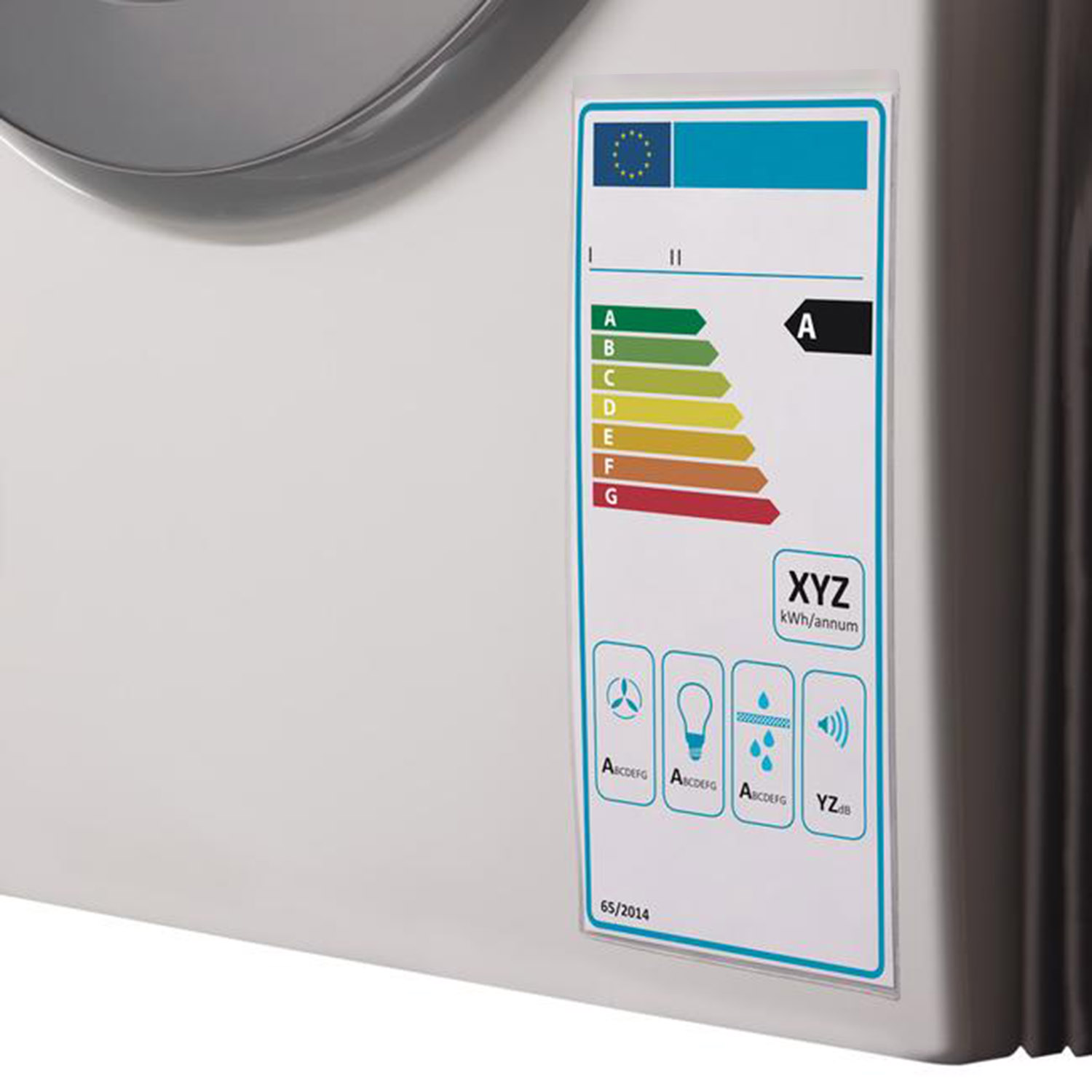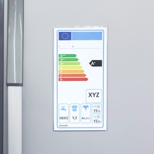 Buzdolabı, çamaşır makinesi, bulaşık makinesi, klima veya fırın gibi ürünlerde bulunan A’dan G’ye kadar enerji sınıfı etiketleri bu şeffaf PVC cebin içine konur.
