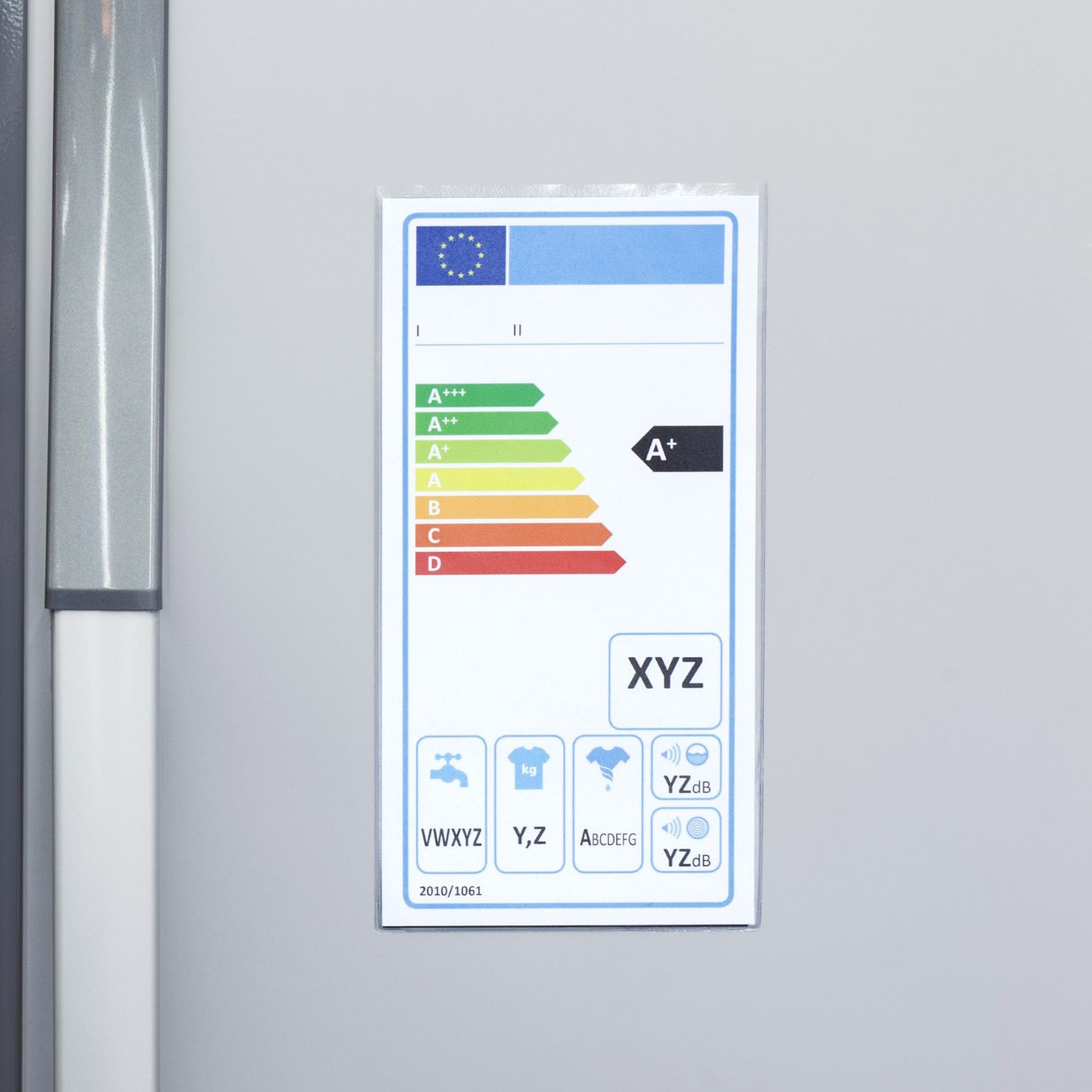 Beyaz eşyaların enerji verimliliği etiketlerini düzenli ve estetik şekilde sergiler.