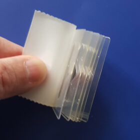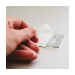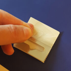 Plastik yapışkanlı ürün askı etiketleri, market ve mağazalarda sergilenecek ürünlere veya ürün kutularına yapıştırabileceğiniz, arkası kendinden yapışkanlı pratik bir üründür. 50×50 mm ölçülerinde, 275 mikron doğa dostu APET malzemeden üretilmiştir. Şeffaf yapışkanlı askı etiketinin 29 mm’lik bölümü yapışkanlıdır..