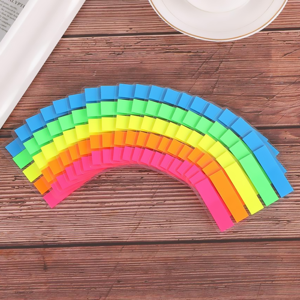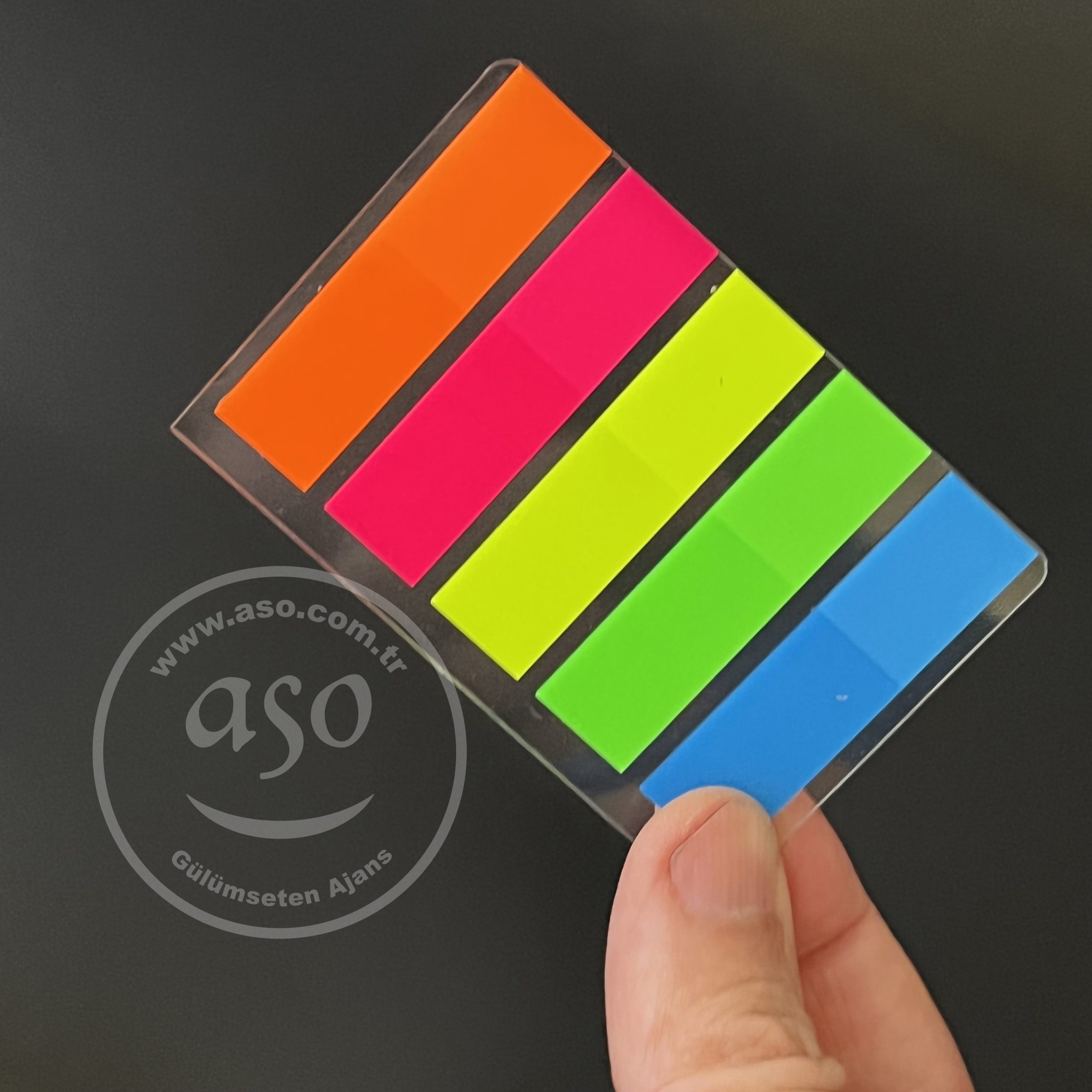 5 renkli postit promosyon ayraç, çeşitli renklerde küçük yapışkanlı not kağıtlarından oluşan bir settir. Bu set genellikle bir promosyon ürünü olarak verilir ve kullanıcılara belgelerini, kitaplarını veya dergilerini işaretlemeleri veya önemli notlarını yazmaları için küçük ve kullanışlı bir seçenek sunar.